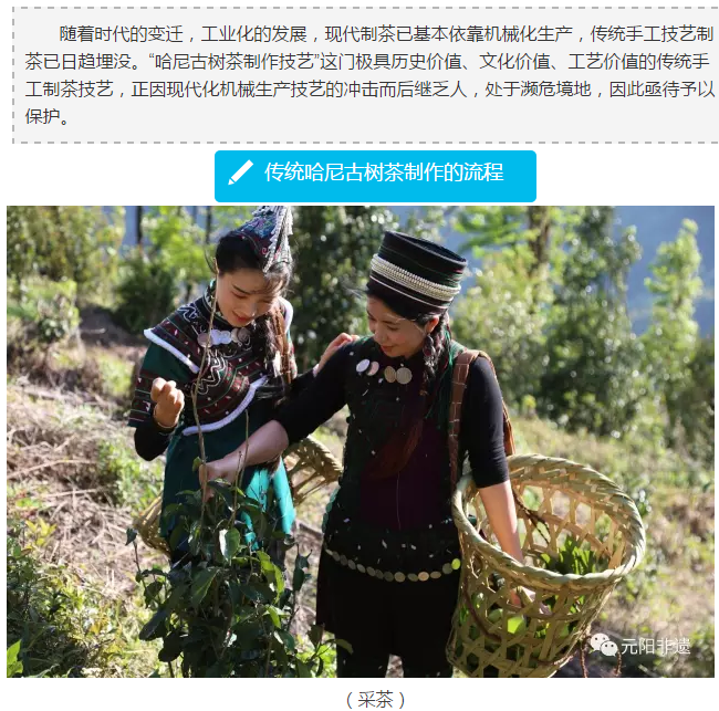 元阳是哈尼族的主要聚居区,也是云南野生古茶树的重要分布区,优厚的自然条件和生态环境,繁育了大面积的野生古茶树群落,这些古茶树群落主要分布在大坪乡、小新街乡、逢春岭乡、上新城乡、嘎娘乡和新街镇,其周边往往都有哈尼人居住,并且年年吐露新芽,与哈尼人结缘,任哈尼人采摘。哈尼人用传统技艺制成的古树茶,以其条索饱满、色泽翠绿、汤色黄绿透亮、滋味醇香、回味悠长等特点而著称,自古以来就深受各族人民喜爱。在“茶马古道”盛行的年代,红河江外土司为了加强与内地的贸易往来,开拓了连通昆明、思茅等地的马帮驿道,而辛苦奔走在这些驿道上的哈尼子弟,他们把哈尼古树茶运到各地,对“茶马古道”的兴盛做出了极大的贡献。