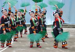 人们手拿棕榈叶,充当能为民族带来吉祥幸福的白鹇鸟羽翼,在具有傣族舒缓、柔美特点的乐曲伴奏下,模拟白鹇鸟在树下嬉戏、漫步、四处窥探等自然形态。舞蹈动作古朴、细腻,充分表现了哈尼族人民对美好生活的向往。