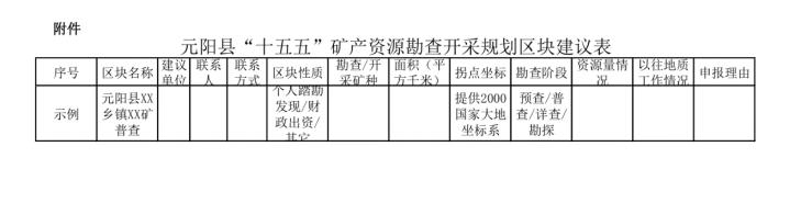 根据《矿产资源法》的有关规定,为高质量做好我县“十五五”矿产资源规划编制工作,充分收集社会各界关于我县矿业高质量发展的意见建议,优化矿产资源勘查、开发利用和保护布局,元阳县自然资源局向社会各界征集“十五五”矿产资源勘查开采规划区块建议。