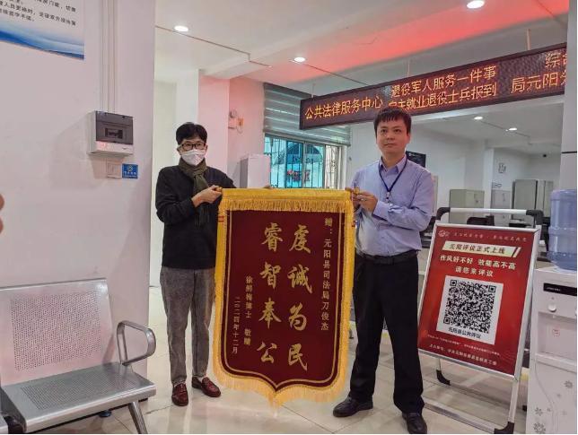 12月24日,徐女士代表其侄女朱女士,专程前往元阳县政务服务中心公共法律服务窗口,赠送了一面印有“虔诚为民,睿智奉公”的锦旗,以此表达对窗口工作人员刀俊杰认真负责、尽职尽责优质服务的诚挚感谢。