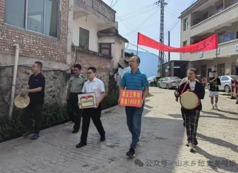 在嘎娘乡大伍寨村,伴随着喜庆热闹的锣鼓声,送喜报队伍一路拉着横幅,郑重地将喜报交到张志云及其家属手中,并为张志云及其家属披绶带、戴红花,让军人军属共享荣光。