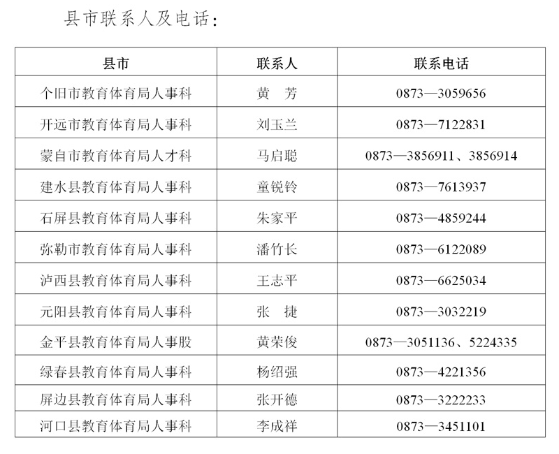 2022年红河州个旧、开远、蒙自、建水、石屏、弥勒、泸西、元阳、金平、绿春、屏边、河口12县市共设置中小学义务教育“特岗计划”岗位375个。其中:初中教师岗位144个,小学教师岗位231个(具体岗位计划设置详见附件1)。