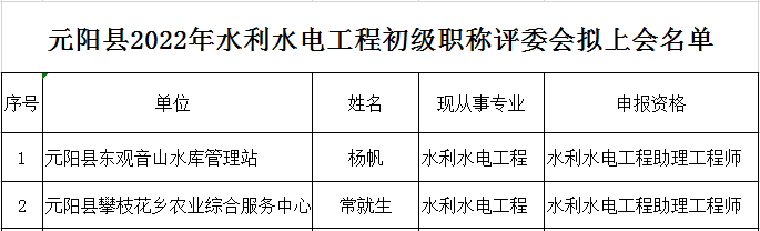 根据《元阳县人力资源和社会保障局关于做好2022年度初级职称评审工作的通知》(元人社发〔2022〕54号)文件要求,元阳县水务局对2022年申报水利水电工程初级职称人员的范围对象、申报条件和审核推荐程序进行了资格审核,拟同意将杨帆、常就生两位申报人员提交评委会评审。现予以公示,公示期为5月25日一5月31日。
