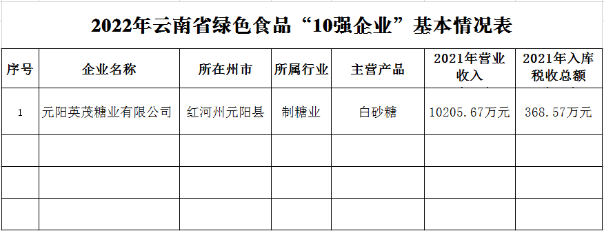 根据云南省农业农村厅 云南省工业和信息化厅 云南省人力资源和社会保障厅《关于开展2022年云南省“10大名品”和绿色食品“10强企业”“20佳创新企业”评选申报活动的通知》(云农市〔2022〕1号)以及州级相关文件要求,经企业自主申报、县级相关部门审核通过后,以下1户企业拟作为2022年云南省绿色食品“10强企业”推荐对象,现予以公示。公示期为2022年5月30日至2022年6月6日。