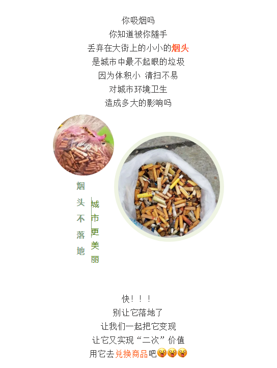据悉,此次活动中已兑换的烟头将由工作人员通知环卫站及时做辗压处理,防止二次回收和二次污染。