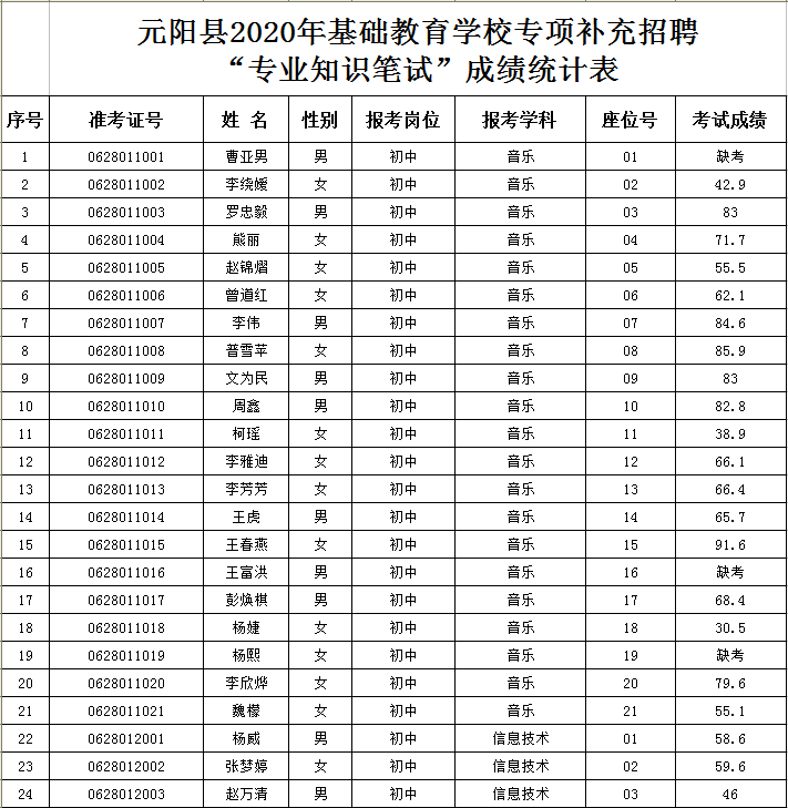 一、笔试成绩详见附件:《元阳县2020年基础教育学校专项补充招聘“专业知识笔试”成绩统计表》