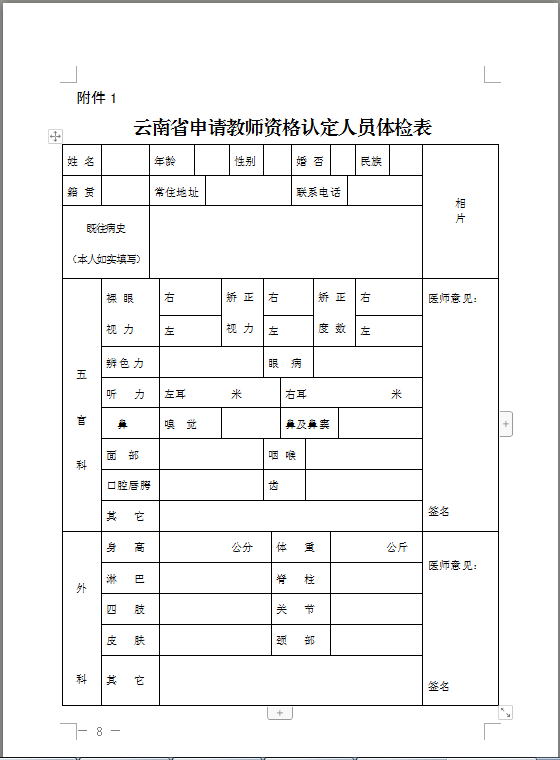 (3)《云南省申请教师资格认定人员体检表》原件(见附件)。经《红河州第一人民医院》或《元阳县人民医院》医院体检后,体检结论签署 “合格”且有体检医院意见并加盖公章的《云南省教师资格认定体检表》原件。(体检表必须双面打印)