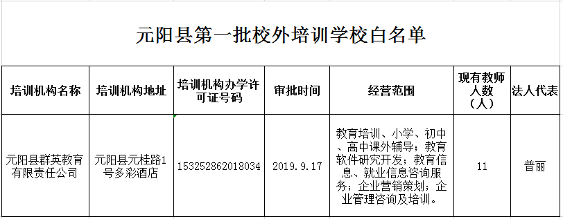 根据《国务院办公厅关于规范校外培训机构发展的意见》(国办发(2018)80号)、《云南省教育厅关于改进校外培训机构设置工作有关事项的通知>(云教发(2018)169号)、《云南省民办教育机构管理办法》文件精神,元阳县教育体育局组织考评组对元阳县群英教育有限责任公司校外培训学校进行实地评估,并将评估结果报市教育体育局局务会研究,认为元阳县群英教育有限责任公司校外培训学校办学条件达到要求,同意立入白名单并公告。