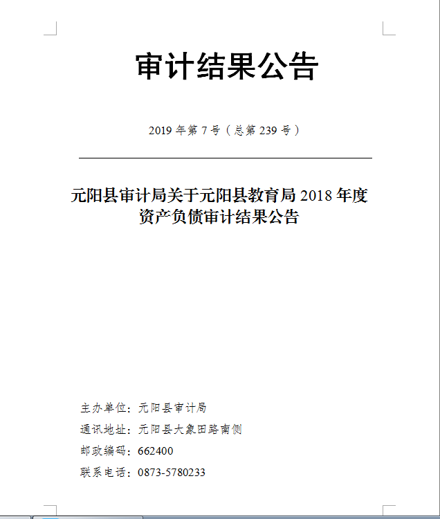 根据《中华人民共和国审计法》规定,元阳县审计局于2019年2月,对元阳县教育局(以下简称:县教育局)2018年度资产负债情况进行了专项审计。