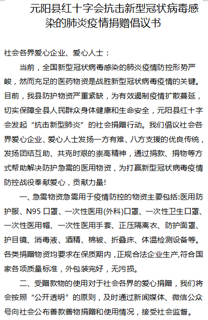 当前,全国新型冠状病毒感染的肺炎疫情防控形势严峻,然而充足的医药物资是战胜新型冠状病毒疫情的关键。目前,我县防护物资严重紧缺,为有效遏制疫情扩散蔓延,切实保障全县人民群众身体健康和生命安全,元阳县红十字会发起“抗击新型肺炎”的社会捐赠行动。我们倡议社会各界爱心企业、爱心人士发扬一方有难、八方支援的优良传统,发扬团结互助、共克时艰的崇高精神,通过捐款、捐物等方式帮助解决防护急需的医用物资,为打赢新型冠状病毒疫情防控战役奉献爱心,贡献力量!