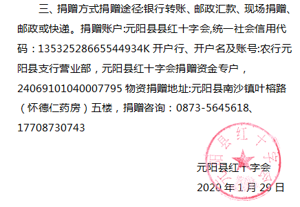 三、捐赠方式捐赠途径:银行转账、邮政汇款、现场捐赠、邮政或快递。捐赠账户:元阳县县红十字会,统一社会信用代码:13532528665544934K开户行、开户名及账号:农行元阳县支行营业部,元阳县红十字会捐赠资金专户,24069101040007795物资捐赠地址:元阳县南沙镇叶榕路(怀德仁药房)五楼,捐赠咨询:0873-5645618、1*******743