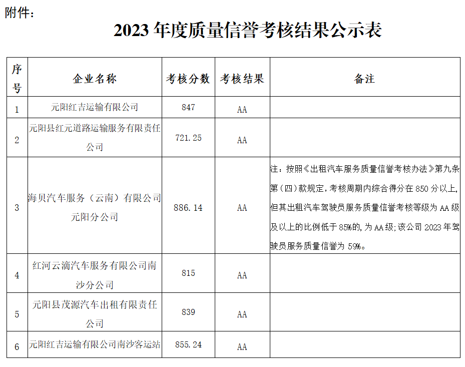 根据《红河州交通运输综合行政执法支队转发云南省交通运输厅关于进一步加强道路运输企业质量信誉考核工作的通知》(红交执法便〔2023〕146号)要求,元阳县交通运输局严格按照《云南省道路旅客运输企业质量信誉考核实施细则(试行)》《云南省汽车客运站质量信誉考核办法(试行)》《出租汽车服务质量信誉考核办法》等规定对辖区内的客运企业、客运站及出租汽车企业(含巡游出租汽车企业、网络预约出租汽车企业)开展2023年度质量信誉考核,现将考核结果予以公示(详见附件),公示期为10日。