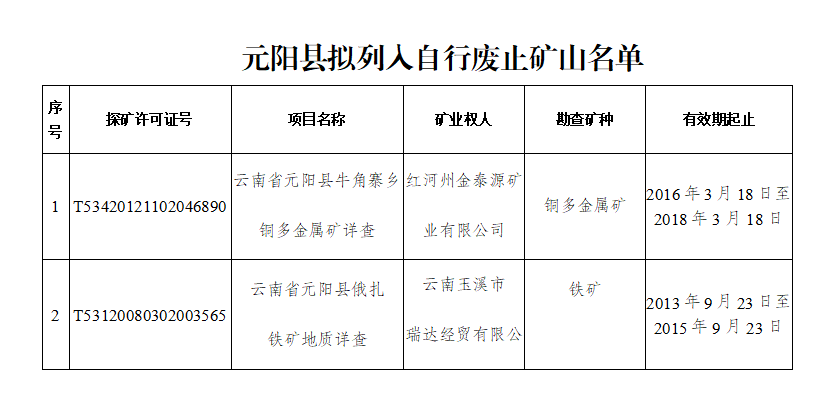 根据《云南省探矿权采矿权管理办法》(云政发〔2015〕49号)、《自然资源部办公厅关于开展全国矿业权登记信息及发布系统数据清理工作的通知》(自然资办函〔2021〕1303号)、《云南省自然资源厅关于开展全省过期矿业权核实工作的通知》(云自然资矿管〔2021〕93号)等文件要求,结合元阳县矿业权管理工作实际,现将云南省元阳县牛角寨乡铜多金属矿详查、云南省元阳县俄扎铁矿地质详查2个矿山按规定列入自行废止名单。