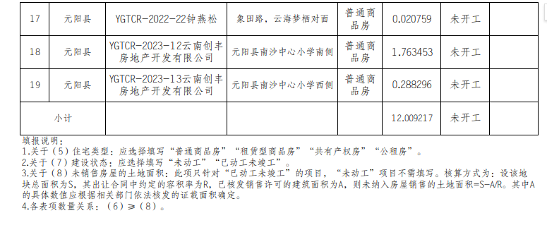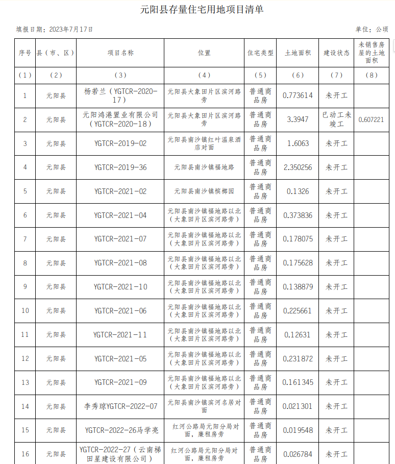 元阳县存量住宅用地项目信息公示(2023年第二季度)