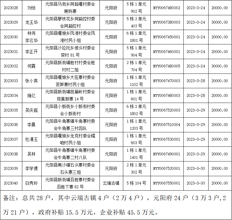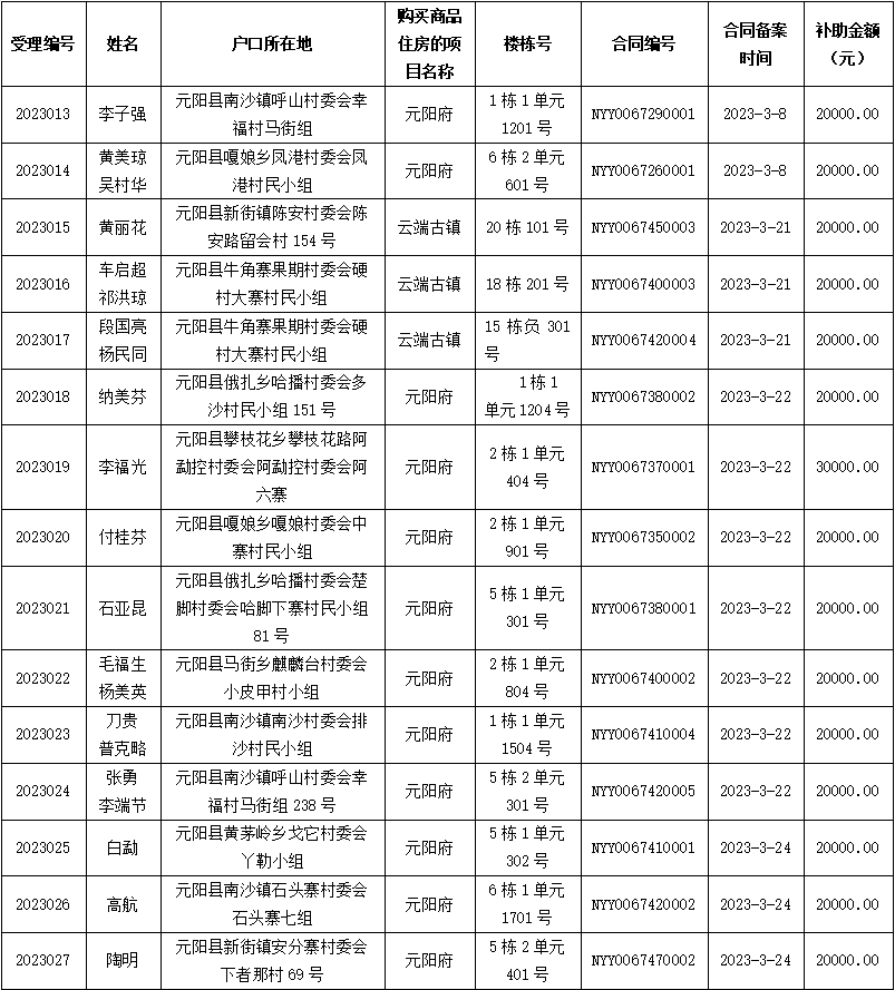 根据《元阳县人民政府办公室关于印发元阳县支持购买商品住房实施细则(试行)的通知》元政办发〔2023〕2号文件精神,我局对2023年3月1日至3月31日期间进行《商品房购销合同》登记备案符合补助条件的人员材料进行了审核。户籍地为哈尼梯田世界文化遗产核心区18个行政村82个村小组的农业户口补助30000元,核心区以外农业户口补助20000元。现将符合补助条件的人员名单公示如下: