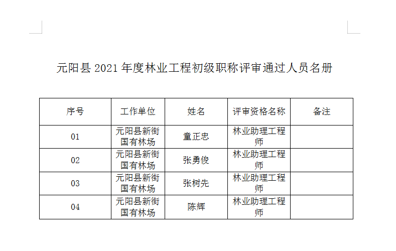 根据《红河州人力资源和社会保障局关于做好2021年度专业技术职称评审工作的通知》(红人社发〔2021〕35号)文件要求,元阳县林业工程初级专业技术职务评审委员会于2021年12月28日对上会参评人员进行资格评审,同意童正忠等4位同志具备助理工程师专业技术职称任职资格。现予以公示,公示期为5个工作日(2021年12月29日—2022年1月5日)。公示期间,如对审核结果有异议,可向县纪委监委驻农业局纪检监察组,电话:0873—3067370;县人力资源和社会保障局专业技术人员管理科,5645180;县林草局机关党组(人事),5642816反映。