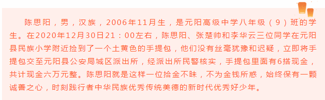 根据红河州文明办《关于组织开展2021年“新时代红河好少年”推荐学习宣传活动的通知》安排,为培育和践行社会主义核心价值观,推出一批事迹生动感人的青少年先进典型,为广大未成年人树立可亲可敬可学的榜样,帮助未成年人“扣好人生第一粒扣子”,努力成长为德智体美劳全面发展的社会主义建设者和接班人,县文明办、县教育体育局、团县委、县妇联、县直机关工委、县融媒体中心等部门共同开展了元阳县2021年新时代好少年推选活动。