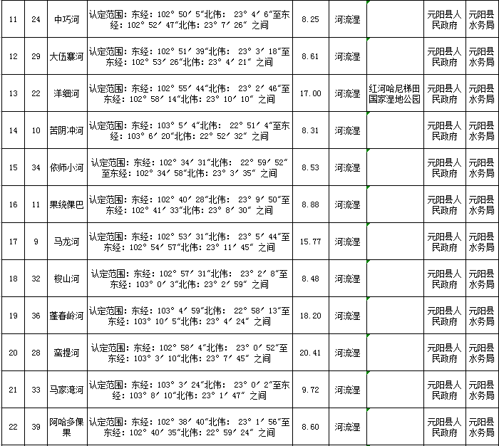 根据《云南省人民政府办公厅关于贯彻落实湿地保护修复制度方案的实施意见》(云政办发〔2017〕131号),《红河州林业局关于分解下达湿地保护修复体系任务指标的通知》(红林保护〔2018〕68号)及《红河州人民政府办公室关于印发红河州一般湿地认定办法的通知》(红政办发〔2017〕111号)文件精神,现将元阳县第一批一般湿地认定名录进行公示(见附件)。