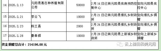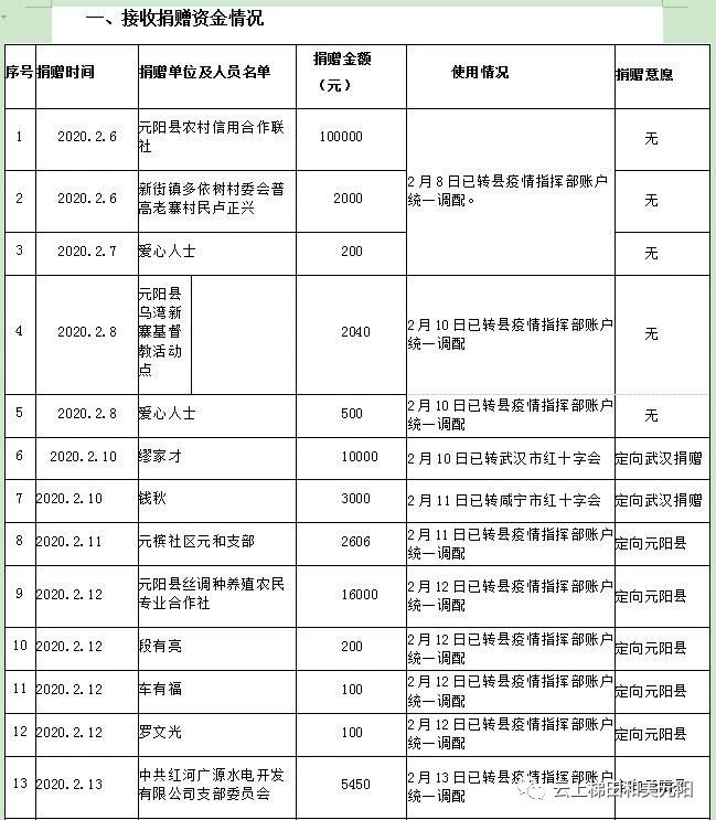 元阳县应对新型冠状病毒感染的肺炎疫情防控工作以来,县红十字会积极发挥党和政府在人道领域联系人民群众的桥梁和纽带作用,广泛动员爱心企业和个人为抗击新型冠状病毒感染的肺炎疫情奉献爱心,履行社会责任。 截止2020年2月28日16时,元阳县红十字会共接收用于新型冠状病毒感染的肺炎疫情防控社会捐赠资金及物资价值累计219530元。其中:捐赠资金214196元,捐赠物资价值5334元。 自开展疫情防控捐赠款物接收工作以来,所接收的捐赠款物有捐赠意向的按捐赠方意向安排,无捐赠意向的款物由县疫情防控指挥部统筹安排使用。具体情况如下: