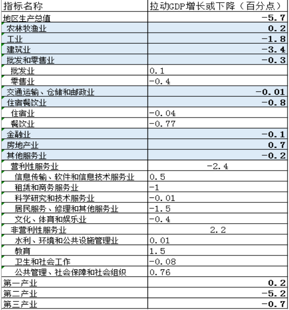 营利性服务行业大幅下降。主要是:租赁和商务业营业收入下降82.3%,居民服务业营业收入下降23.3%,文体娱乐业营业收入下降97.8%,科技服务业营业收入下降7.8%,最终整个营利性服务业增加值下降26.8%,拉动GDP下降2.4个百分点。