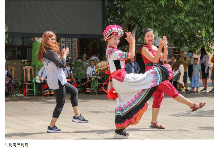 “远方的客人请你留下来。”在弥勒,令国际青年一行流连忘返的还有热情的阿细跳月。位于西三镇的可邑小镇是彝族阿细人的故乡。国际青年一行一下车,便被热情好客的阿细姑娘邀请,共跳阿细跳月。欢快的旋律拉近了中外青年的距离,浓郁的少数民族文化气息让上合国家青年平台创始人胡凤兰兴奋不已,她直言:“没想到能在红河参与如此丰富的少数民族体验和互动。”