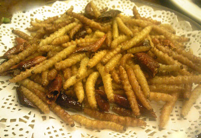 竹虫,又名竹蜂、竹蛆。寄生在竹筒内,以食嫩竹为主,从竹尖逐节往下吃,最后藏于根部筒内,到11月份体肥停食,宜捕,过时则变蛹。竹虫。不仅哈尼族喜食,壮族、布依族亦喜食善捕。布依族居住的河谷地带,楠竹茂密,视其竹尖发黄,即可剖开竹茎采取。竹虫经炸后色泽金黄而油亮,酥脆芳香,蛋白质含量高,是佐酒佳肴。