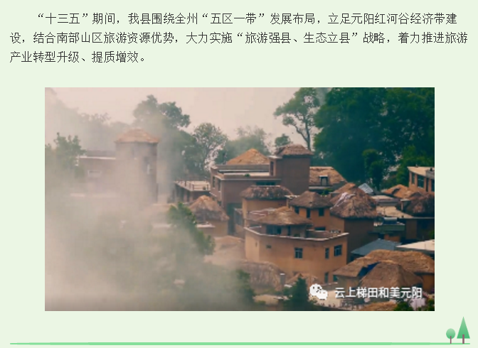 十三五期间,我县全力推动文旅体融合发展,依托文化节庆活动,积极开发以体验民族特色节庆活动为亮点的旅游产品,成功举办第一届、第二届“开秧门”实景农耕文化节、第二届元阳哈尼梯田国际越野马拉松比赛、第三届红河哈尼梯田世界文化遗产摄影双年展、中国农民丰收节稻花鱼丰收节等系列节庆活动,文化旅游产品不断丰富。国家交响乐团红河州创作实践基地落户哈尼小镇,《哈尼交响·欢乐新春》专场音乐会在国家大剧院音乐厅成功上演并进行全球巡演。