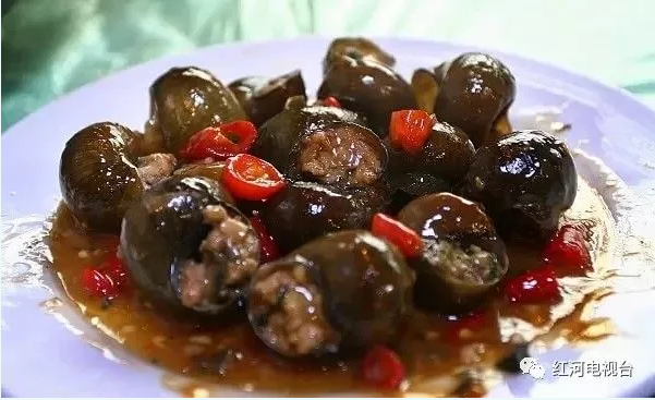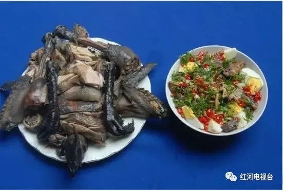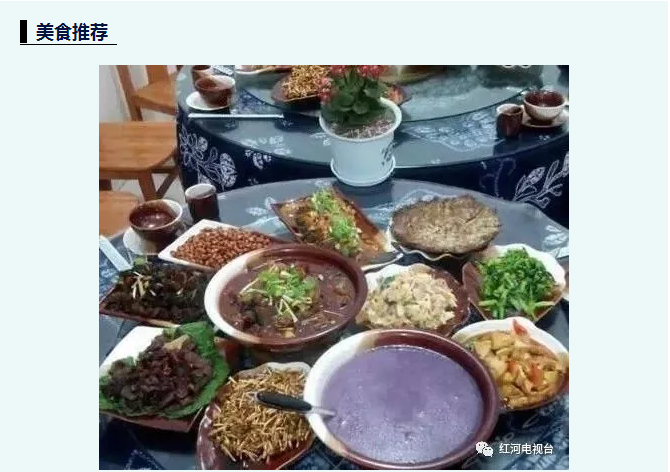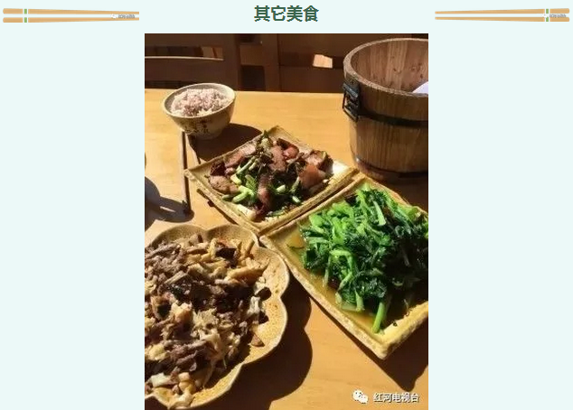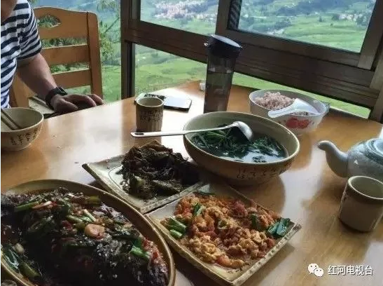 来看梯田一定要吃红米饭,红米米线,树花菜,田螺、田鱼、土鸡、牛肉。