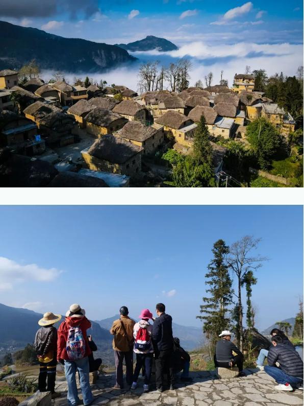 “蘑菇房底座是由石头砌成的,可以看一下我们的外墙就是由深土铸成的土砖结构,屋顶就是咱们的毛草顶构成,我们的蘑菇房一般分为三层······”走进阿者科村,村民导游高花一边带领游客游览古村落,一边给游客进行讲解。