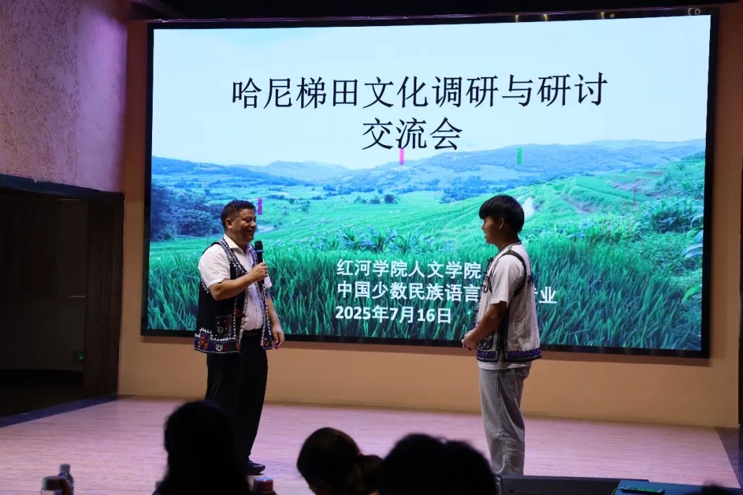 红河学院人文学院中国少数民族语言文学专业带队教师之一、元阳土生土长的哈尼族学者黄绍文教授,每年假期都会带学生来研学。黄教授耐心讲解哈尼族悠久的农耕文明、“四素同构”生态系统及歌舞服饰等文化精髓。学生们通过实地调研、走访、歌舞交流等形式,感受哈尼族文化的独特韵味。