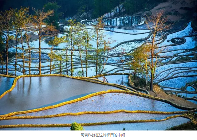 在梯田深处的原始村子——阿者科,他们四季生活在这里,男耕女织,勤劳朴实。阿者科村是非常典型的哈尼族村寨,村寨位于半山腰,村寨上方遍布着茂盛的原始森林,其中村口的寨神林则象征着神明,不可破坏。村寨外围海拔较低处,尽是长期开分的多级梯田,是村庄的农业生产的空间,主要种植水稻和玉米。村寨则由一栋栋传统民族建筑蘑菇房组成,错落有致。村庄采用重力自流的方式通过沟渠和管道取山泉水。这种传统的人居环境充分体现了山、水、村、田、林和谐共生的关系。