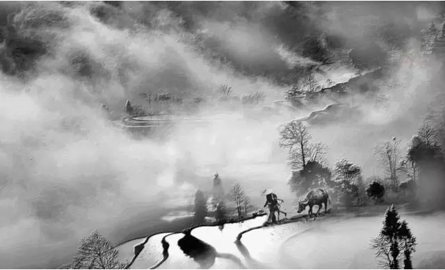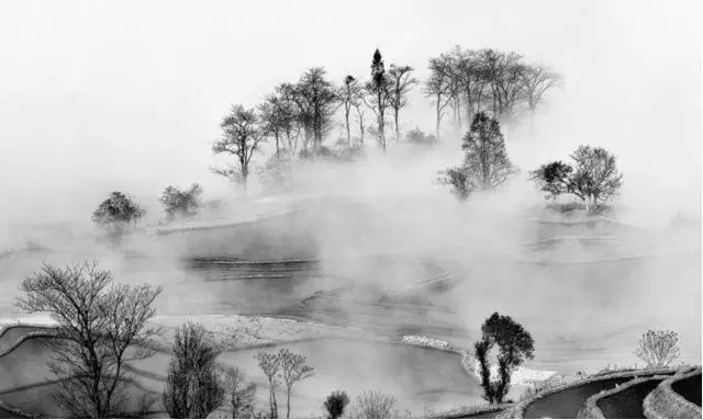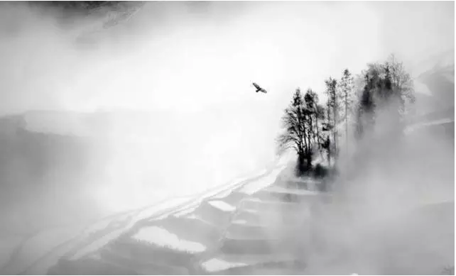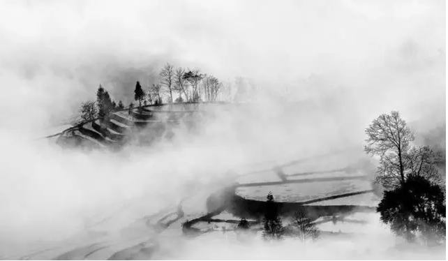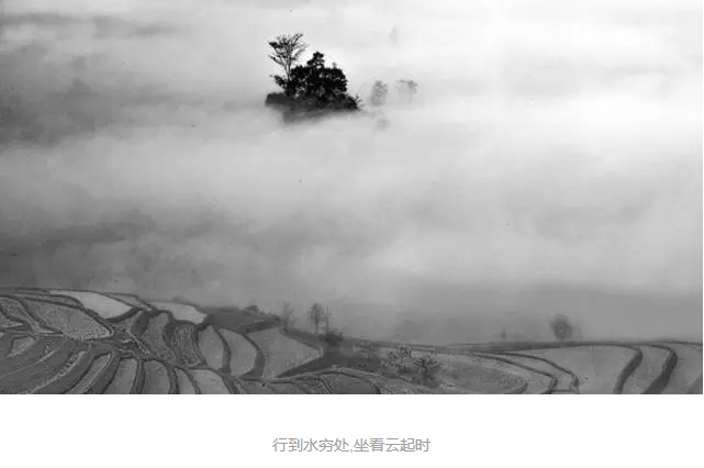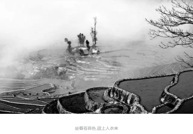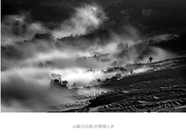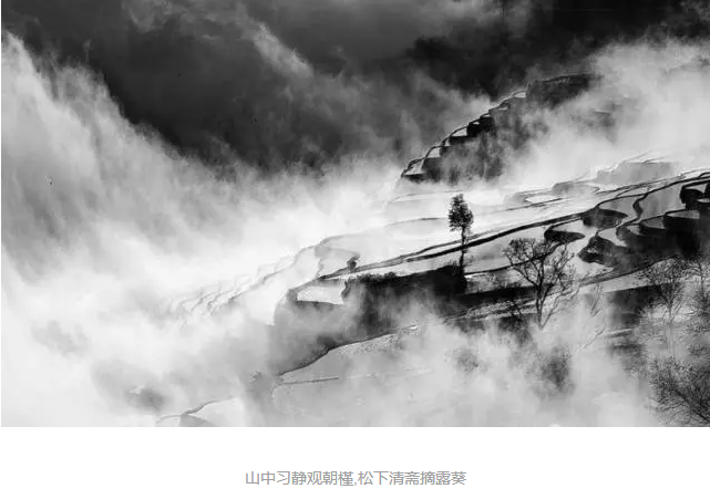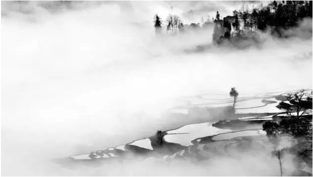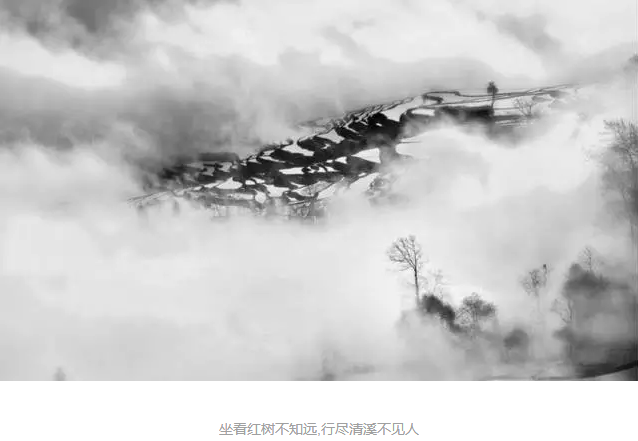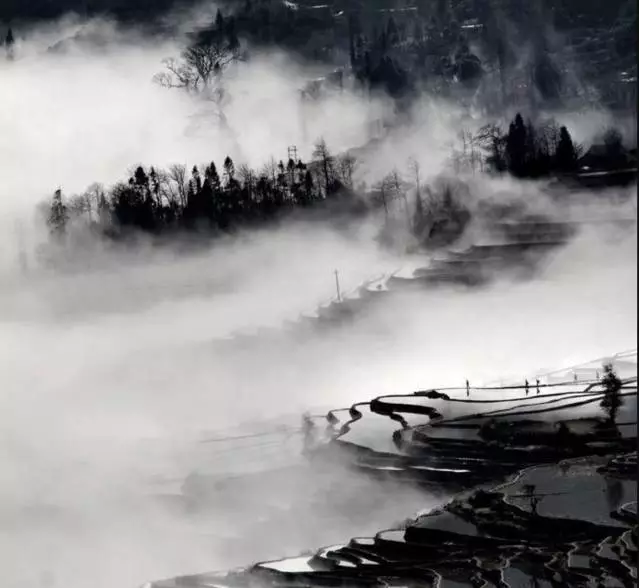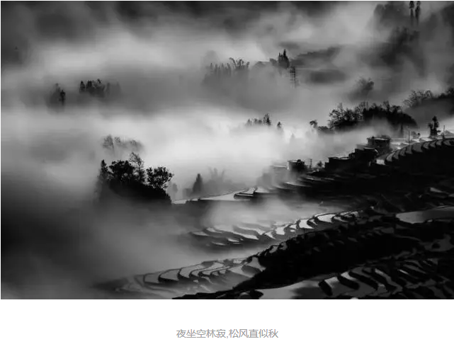 照片中墨色的近浓远淡,产生了丰富的摄影层次及变化,这样的表现形式使哈尼梯田充满了传统的国风之感又不失神秘。