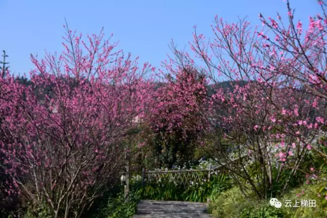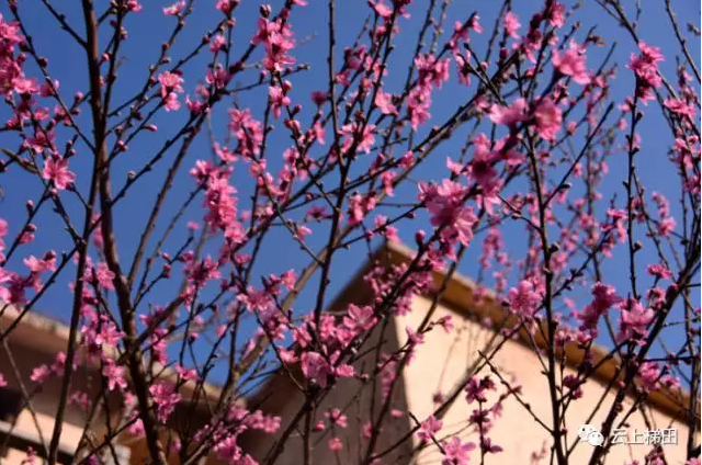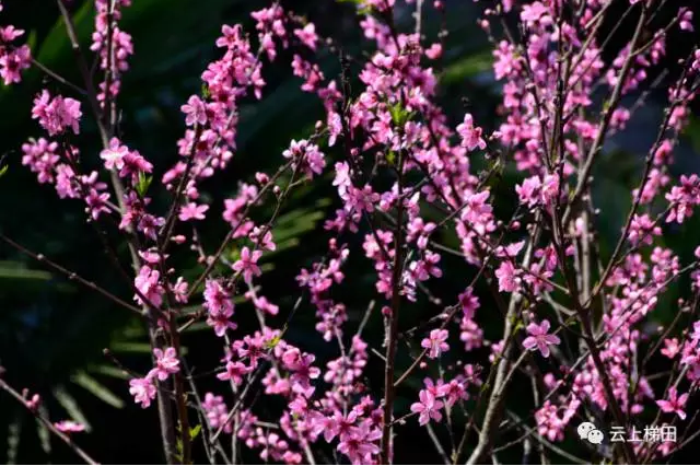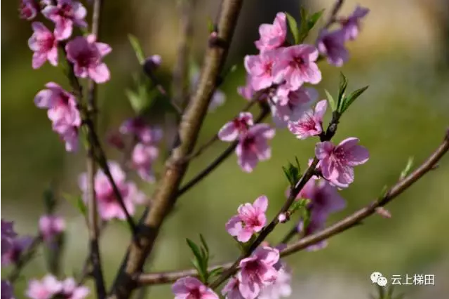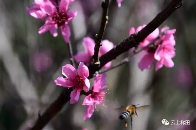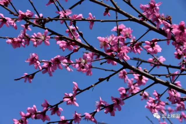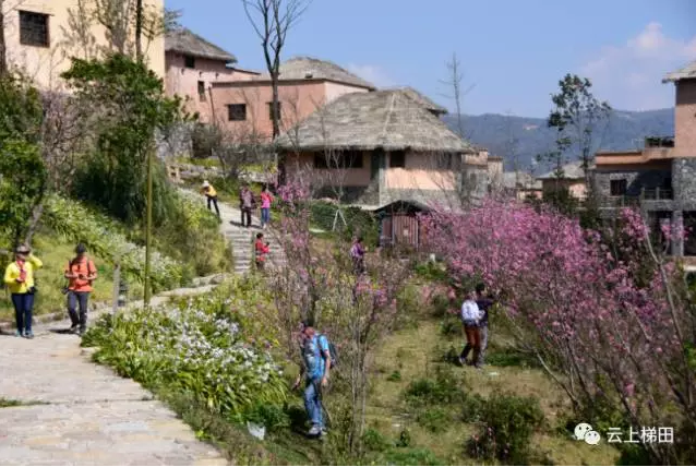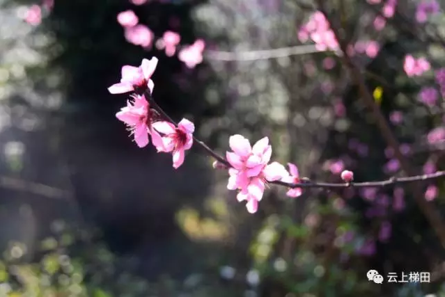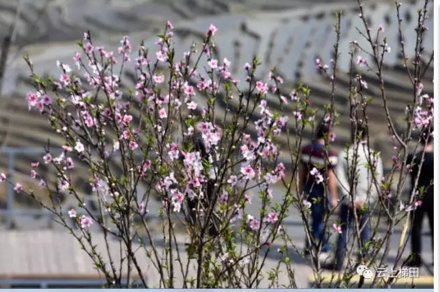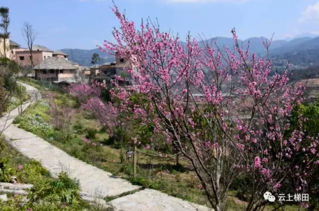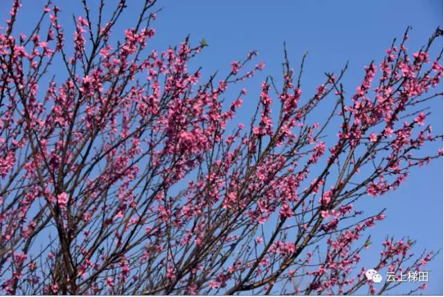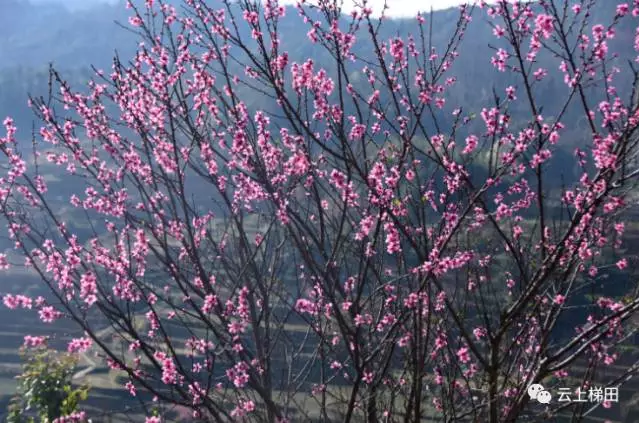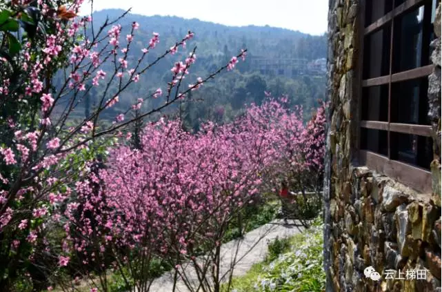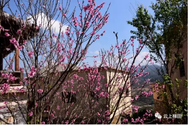 漫山遍野的桃花层层叠叠,如云似霞,春意盎然的哈尼小镇美不胜收