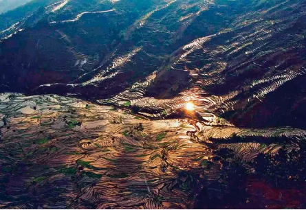 领受阳光,哈尼梯田用自己的水波去呼应着变幻不定的阳光,透明的、绚丽的、耀眼的、轻柔的。在这种呼应中,哈尼梯田有了流光溢彩的美丽。