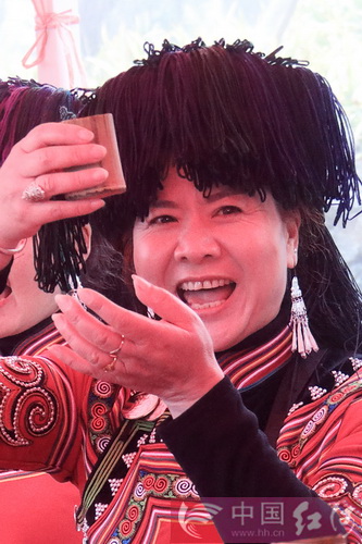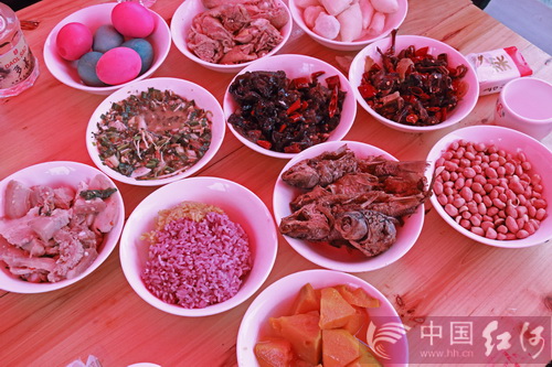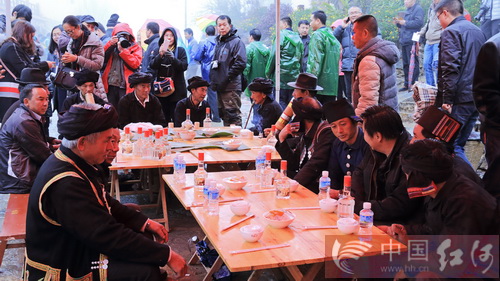 这天,虽然雾气蒙蒙,天气寒冷,但人们的热情不减,在数百米长的街道上,180桌美味佳肴一桌连一桌沿街摆放,花米饭、三色蛋、猪肉、鸡肉、肉鱼、牛干巴等10多个哈尼族风味的菜肴摆满桌子,任由来宾品尝。歌声、笑声、敬酒声此起彼伏,一浪胜过一浪,大家吃菜、喝酒、互相祝福,锣鼓喧天,热闹非凡。