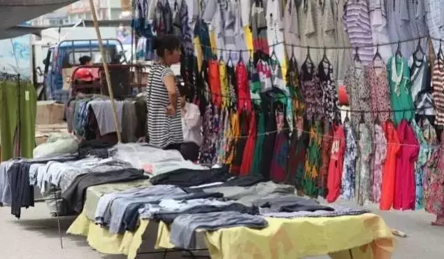 集市上的服装摊,卖的不是牌子,价格便宜。