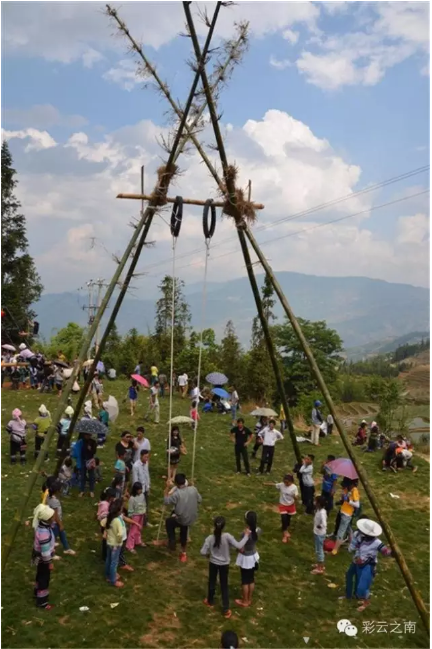 一年一度欢乐的“矻扎扎”节来到时,哈尼山寨一片欢腾。青年男女穿上五彩缤纷绚丽鲜艳的服装,成群结队地聚集在磨秋场上骑磨秋欢度节日。骑磨秋,是哈尼族特有的,也是有趣的体育活动。那些骑磨秋艺高胆大的小伙子,往往成为姑娘们爱慕的对象。