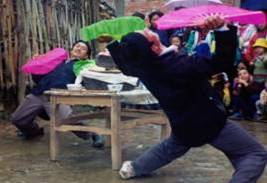 哈尼语中的“侗尼尼”,译成汉语叫芒鼓舞。“侗尼尼”的伴奏乐器是铜鋩和牛皮鼓。鋩声鼓点节奏鲜明.舞蹈动作一是一,二是二,节奏感十分讲究显示出节奏、力量和刚柔的美。跳“侗尼尼”一般都在酒后,趁着酒兴,微带醉意,然后让情绪沉入庄严古朴的鋩鼓声中而手舞足蹈。跳舞时全身无一道关节、无一块肌肉不在颤动,手臂和肩、腰、臀、腿、脚齐用力,动作深沉粗犷,刚健柔韧,感情纯朴真挚。