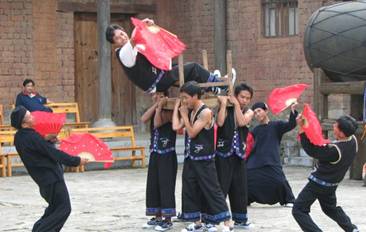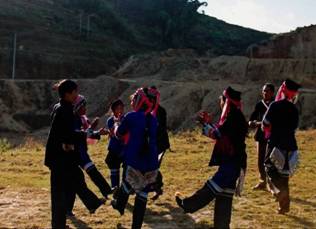 第四是在农事、农闲、盖房和“串姑娘”等时候行。 哈尼族不论上山砍柴,下田种地,或者集市贸易,都要歌舞。哈尼人说“满坡梯田是歌声唱绿的”。休息时,就在田埂上欢跳“乐作”。红河县阿扎河街子,成千哈尼人围成无数舞圈,哪怕天下大雨,也仍跳乐作,谓之“歌舞街”。房屋建成,必要歌舞贺新房。哈尼青年“串姑娘”时候,青年男女相邀到“公房”或者山林中,“男女连手周旋跳舞为乐”,传递爱恋的信息。