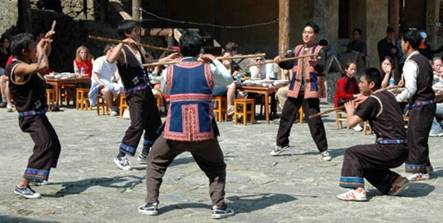 哈尼族铓鼓舞是哈尼族在传统节日“昂玛突”上跳的一种祭祀舞蹈。舞蹈雄浑豪放,气势轩昂,质朴劲健,热情洒脱,表现出了哈尼人大山一样的性格,森林一样的情怀。铓鼓舞产生于哈尼族以狩措为生的古代。人们为了在狩猎时进行联络和邀约猎手,由无意中发现打击山中空心树会发出响声,于是他们用原木凿空绷上牛皮,做成了鼓。鼓声除进行联络和邀约猎手外,有时也可以轻轻地敲击起到吸引猎物的作用,若是单身或人少而碰到猛兽时,急风暴雨似的击打又可以起到口下跑野兽防身自卫的作用。那古朴、深沉、凝重、韵律非凡而神秘的舞姿将围观者的思绪带到了远古时代的哈尼部落,亲眼目睹哈尼先民们与大自然英勇抗争。随着社会的发展,他们又模仿农业生产的农耕动作,使铓鼓舞得到了丰富的发展,特别是铜的发现和利用,开始有了铓,成了名副其实的铓鼓舞。