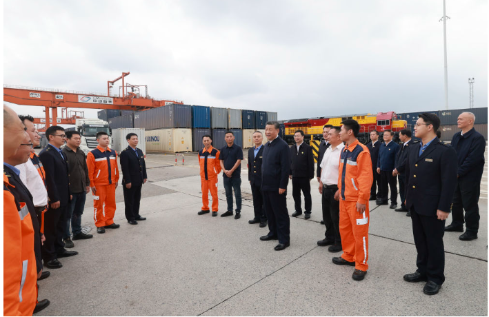 4月22日至24日,中共中央总书记、国家主席、中央军委主席习近平在重庆考察。这是22日下午,习近平在重庆国际物流枢纽园区重庆铁路集装箱中心站,同货车司机、列车司机、装卸工人、场站管理人员等亲切交流。新华社记者 岳月伟 摄