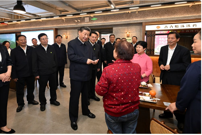 4月22日至24日,中共中央总书记、国家主席、中央军委主席习近平在重庆考察。这是22日下午,习近平在九龙坡区谢家湾街道民主村社区考察时,同正在社区食堂就餐的群众亲切交流。新华社记者 谢环驰 摄