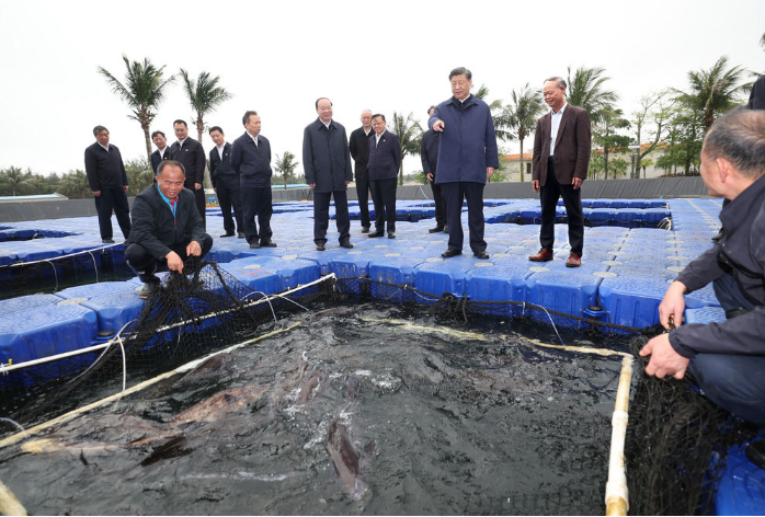 10日上午,习近平首先考察了位于湛江市东海岛的国家863计划项目海水养殖种子工程南方基地。习近平听取了广东省海洋渔业发展情况介绍,察看渔业良种展示,向现场科研和养殖人员询问选育技术、种苗长势、市场价格等。习近平指出,中国是一个有着14亿多人口的大国,解决好吃饭问题、保障粮食安全,要树立大食物观,既向陆地要食物,也向海洋要食物,耕海牧渔,建设海上牧场、“蓝色粮仓”。种业是现代农业、渔业发展的基础,要把这项工作做精做好。要大力发展深海养殖装备和智慧渔业,推动海洋渔业向信息化、智能化、现代化转型升级。