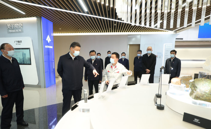 习近平随后来到广汽埃安新能源汽车股份有限公司考察。他走进企业展厅、总装车间、电池生产车间等,了解企业突破关键核心技术和推动制造业高端化、智能化、绿色化等进展情况。在广汽研究院,习近平仔细察看智能网联实验室、模型设计实验室等,并同科技人员、企业家、职工、外资企业代表等交流。习近平指出,中国改革开放政策将长久不变,永远不会自己关上开放的大门。一切愿意与我们合作共赢的国家,我们都愿意与他们相向而行,推动世界经济共同繁荣发展。习近平强调,中国是个大国,要重视实体经济,走自力更生之路。关键核心技术要立足自主研发,也欢迎国际合作。要加强教育和人才培养,夯实科技自立自强根基。