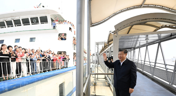 4月10日至13日,中共中央总书记、国家主席、中央军委主席习近平在广东考察。这是10日下午,习近平在湛江市徐闻县徐闻港泊位码头,向船上的旅客挥手致意。新华社记者 燕雁 摄