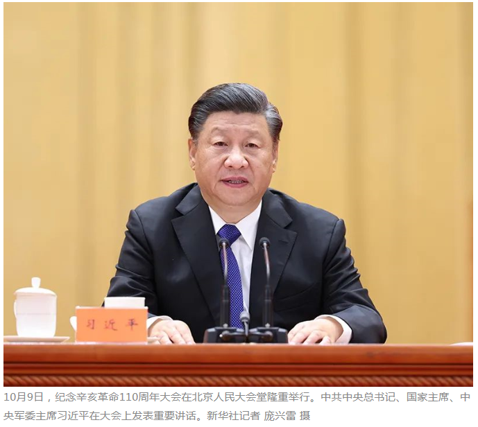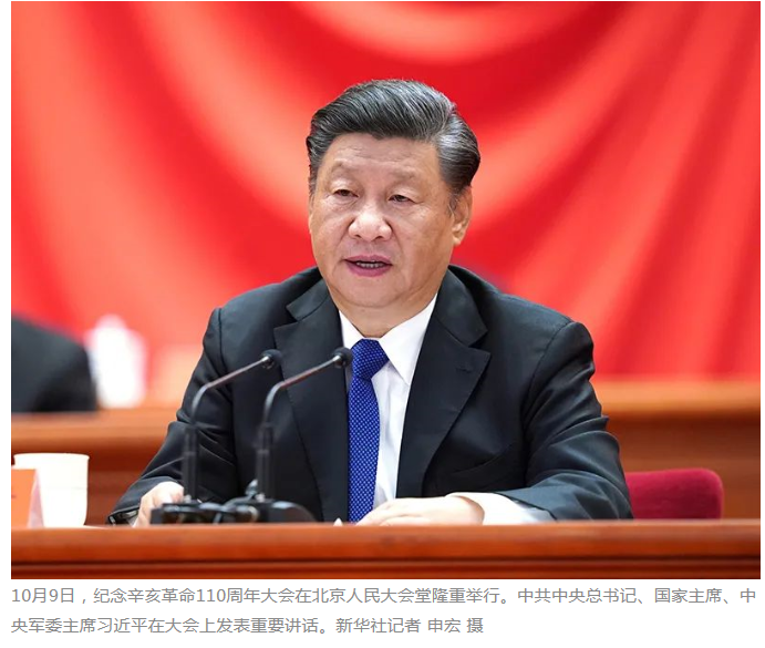 纪念辛亥革命110周年大会9日上午在北京人民大会堂隆重举行。中共中央总书记、国家主席、中央军委主席习近平在会上发表重要讲话强调,今年是辛亥革命110周年,是中国共产党成立100周年,中国人民正意气风发向着全面建成社会主义现代化强国的第二个百年奋斗目标迈进。在这个重要时刻,我们在这里隆重集会,缅怀孙中山先生等革命先驱的历史功勋,就是要学习和弘扬他们为振兴中华而矢志不渝的崇高精神,激励和团结海内外全体中华儿女为实现中华民族伟大复兴而共同奋斗。