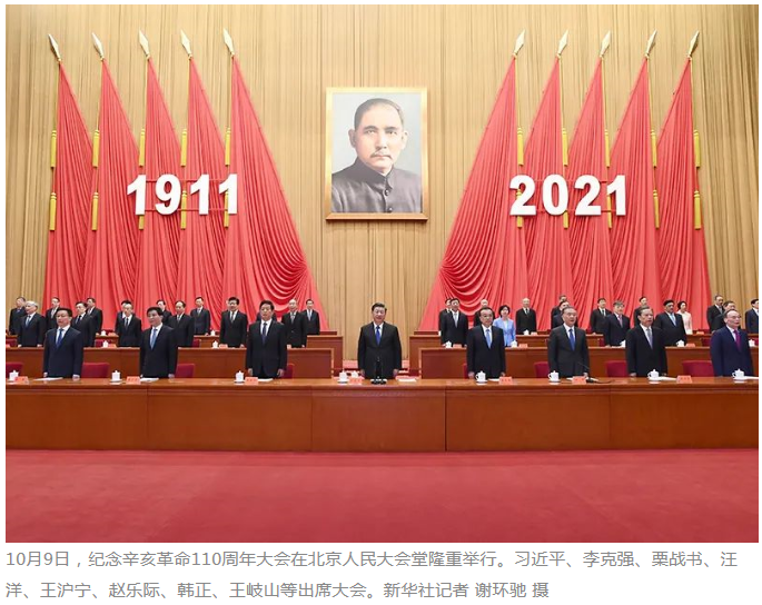 人民大会堂大礼堂气氛庄重热烈。主席台上方悬挂着“纪念辛亥革命110周年大会”会标,后幕正中是孙中山先生画像,10面红旗分列两侧,上面悬挂的“1911”“2021”字标格外醒目。
