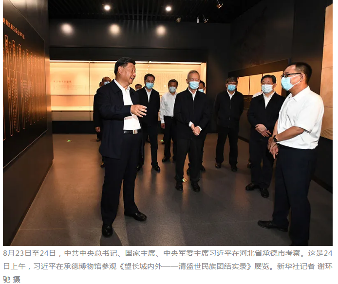 随后,习近平来到承德博物馆,参观《望长城内外——清盛世民族团结实录》展览。习近平走进展厅,不时驻足察看,详细了解清代民族关系发展和多措并举维护民族团结、边疆稳定、国家统一等情况。习近平指出,我国是统一的多民族国家,在漫漫历史长河中形成了多元一体的中华民族。经过全党全国各族人民持续奋斗,我们实现了第一个百年奋斗目标,在中华大地上全面建成了包括少数民族和民族地区在内的小康社会。实践充分证明,只有中国共产党才能实现中华民族的大团结,只有中国特色社会主义才能凝聚各民族、发展各民族、繁荣各民族。要坚持中国共产党领导,坚持走中国特色解决民族问题的正确道路,全面贯彻党的民族理论和民族政策,不断巩固和发展平等团结互助和谐的社会主义民族关系。要围绕实现中华民族伟大复兴做好研史学史工作,整合历史研究资源和力量,提高研究水平和创新能力,更好总结历史经验、揭示历史规律、把握历史趋势。