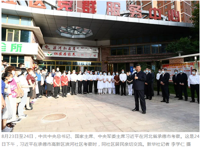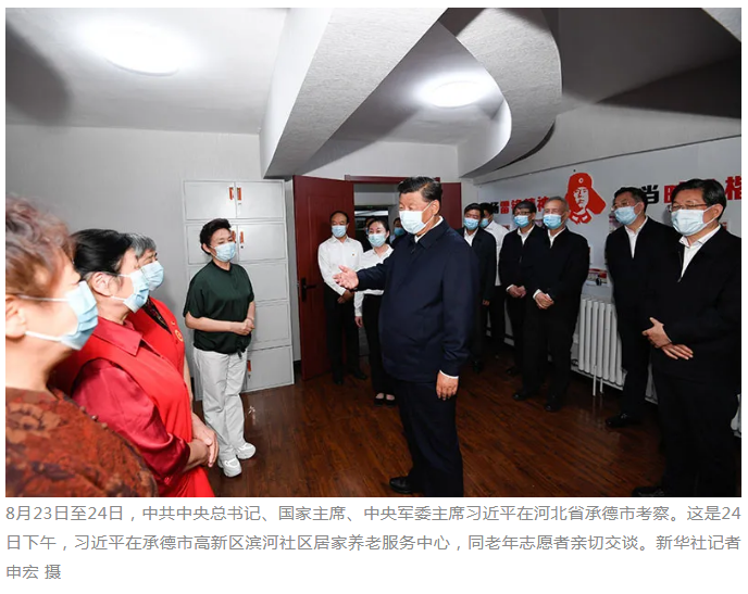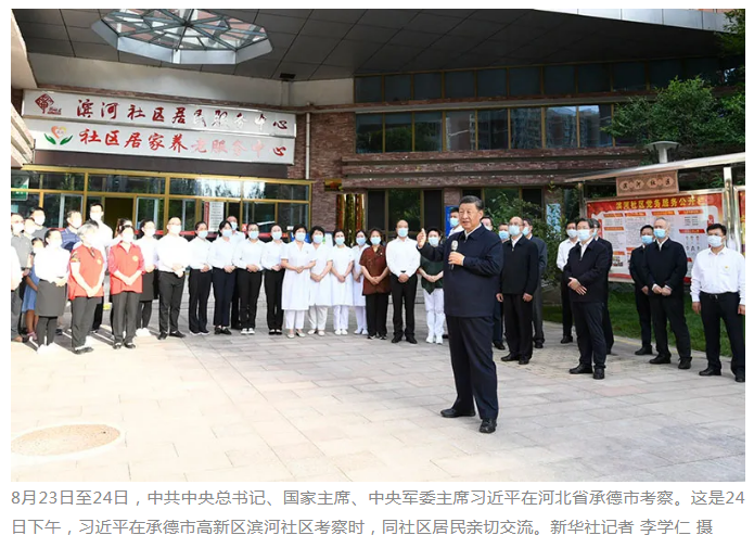 傍晚时分,习近平来到承德市高新区滨河社区居家养老服务中心。近年来,该社区通过政府购买服务、企业运营、社会参与的方式,为社区提供居家养老服务,探索解决老年人健康医疗、生活照料等问题。习近平察看信息化平台、适老化改造等项目,详细询问服务范围、救助方式等事项。习近平指出,满足老年人多方面需求,让老年人能有一个幸福美满的晚年,是各级党委和政府的重要责任。要推动养老事业和养老产业协同发展,发展普惠型养老服务,完善社区居家养老服务网络,构建居家社区机构相协调、医养康养相结合的养老服务体系。要把老有所为同老有所养结合起来,研究完善政策措施,鼓励老年人继续发光发热,充分发挥年纪较轻的老年人作用,推动志愿者在社区治理中有更多作为。要发挥社区作为联防联控、群防群控的第一道防线作用,始终绷紧疫情防控这根弦,全面做好“外防输入、内防反弹”各项工作,坚决克服麻痹思想、厌战情绪、侥幸心理、松懈心态,毫不放松抓好疫情防控。