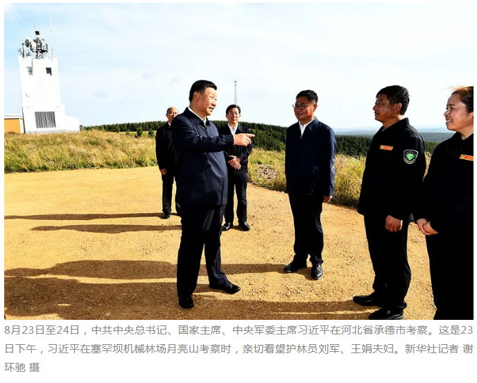 23日下午,习近平首先考察了位于河北省最北部的塞罕坝机械林场。八月的塞罕坝,林海苍翠连绵。林场始建于1962年。近60年来,塞罕坝林场的建设者们听从党的召唤,在“黄沙遮天日,飞鸟无栖树”的荒漠沙地上艰苦奋斗、甘于奉献,创造了荒原变林海的人间奇迹。习近平来到海拔1900米的月亮山,远眺林场自然风貌,听取河北省统筹推进山水林田湖草沙系统治理和塞罕坝机械林场情况介绍,对林场打造人防、技防、物防相结合的一体化资源管护体系,守护森林资源安全取得的成绩给予肯定。习近平强调,我国人工林面积世界第一,这是非常伟大的成绩。塞罕坝成功营造起百万亩人工林海,创造了世界生态文明建设史上的典型,林场建设者获得联合国环保最高荣誉——地球卫士奖,机械林场荣获全国脱贫攻坚楷模称号。希望你们珍视荣誉、继续奋斗,在深化国有林场改革、推动绿色发展、增强碳汇能力等方面大胆探索,切实筑牢京津生态屏障。月亮山上建有集防火瞭望和资源管护为一体的望海楼。习近平亲切看望驻守望海楼13年的护林员刘军、王娟夫妇,并登上望海楼,详细了解他们的日常工作和饮食起居情况,称赞他们默默坚守、无私奉献,守护了塞罕坝生态安全。